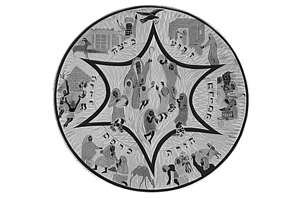 7) An original “Ten Plagues” picture created specifically for this Haggadah. In the design, a tornado devastating the land is also a wine cup containing illustrations of each of the Ten Plagues. The composition additionally includes a representation of when we remove the ten drops of wine from the cup during the Seder (pg. 43).