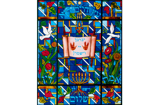 By painting the hands of the Cohen (Jewish priest) on one piece of glass, and attaching it behind the front glass with the Torah painted on it, David created a visual effect that makes the blessing of the priests appear to be radiating from their hands.